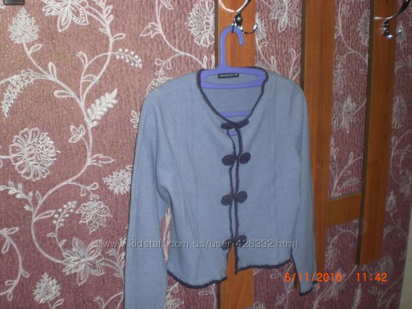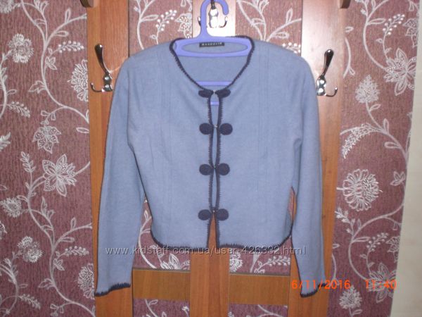 Кофточка-пиджачок красивого фиалкового цвета (гораздо насыщенней, чем на фото) с яркой отделкой. Б/у в отличном состоянии. Очень эффектно смотрится Состав шерсть+ангора Отличный вариант как для юбки так и для брюк. Размер 46-48Длина рукава 59 см