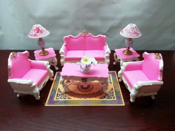 Вся мебель для кукол сделана в фиолетово-розовом цвете с красивой отделкой в современном дизайне.