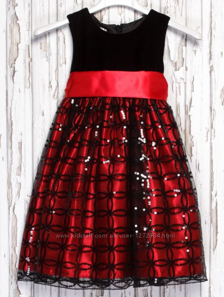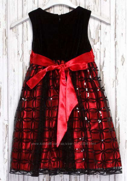 Сукня червона з чорним + паєтки - бренд Mikarden LONDON р. 98, 104 - (матеріал верху: велюр + підкладка нейлон; низ: плотна мікросіточка з вишивкою паєтками + підкладка з плотного атласу + хлопкова підкладка + фатин; пояс: подвійний атлас)