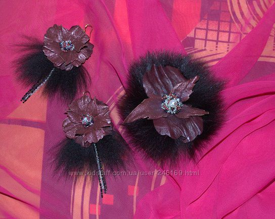 Подробное описание: Авторский комплект из меха и кожи из броши на зажиме и серёжек на серебряно