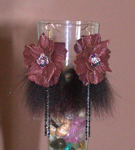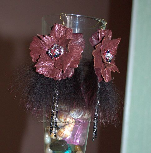 Предлагаю побаловать себя-любимую очень уютным и "тёпленьким" комплектом украшений из натуральной кожи и меха. В комплект входит брошь-цветок на зажиме 2,5 см,что позволяет использовать её не только именно как брошь,но и в качестве заколки для волос, или как украшение Вашего пояса или сумочки.Серьги очень лёгкие,не тянуть мочки. Фурнитура использована серебряная (есть проба).Сейчас в моде длинные и объёмные серьги,так что Вы уж точно не останетесь не замеченной.
