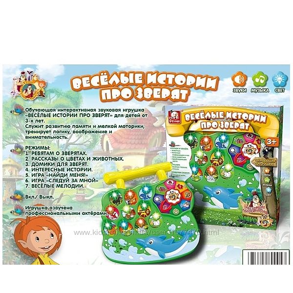 Обучающая развивающая игрушка Истории про зверят. Русский язык. Имеет несколько режимов, свет, звук, песенки, стишки про животных. Развлечет и займёт малыша. Размер 22 на 22 на 4 см.