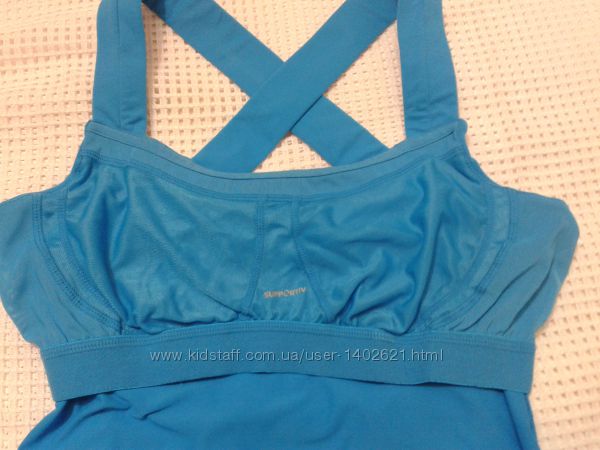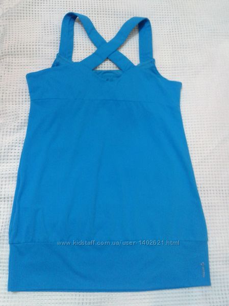 Спортивная майка Domyos, с потайным лифом. Очень мягкая, приятная на ощупь ткань. Длина - 69 см, ширина низа - 41 см, ПОТ - 38, ПОГ - 39Состав: 82% полиэстер, 18% эластан