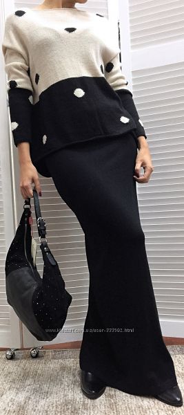 Трикотажная юбка-макси, Timiami . Подходит абсолютно всем, независимо от возраста и типа фигуры. А носить ее зимой - сплошное удовольствие, ведь это удобно, тепло и стильно. Будет великолепно смотреться с тонкими кашемировыми водолазками, объемными свитерами , шерстяными блейзерами, женственными блузками с рюшами или строгими рубашками из плотного хлопка. И не бойтесь использовать аксессуары – шарфы-снуды, меховые шарфы, массивные многоярусные бусы или кулоны на длинной цепочке, длинные перчатки, широкополые шляпы. Они придадут образу богемный шик. Пояс на толстой резинке, сзади небольшой разрез. Состав: 52 район, 35 модал, 8 эластан, 5 кашемир