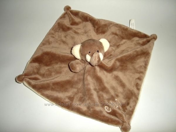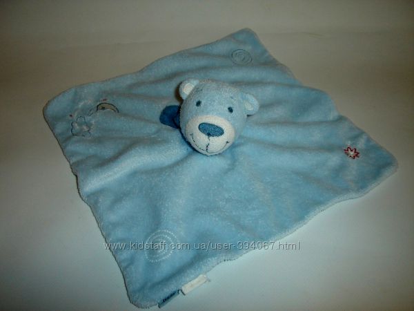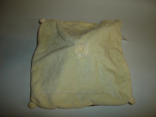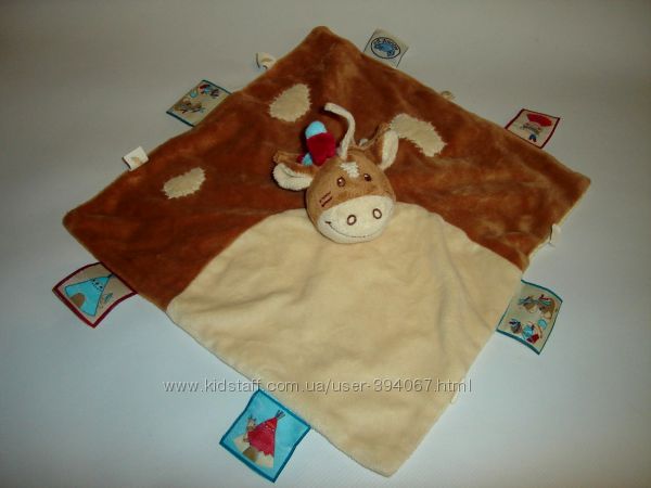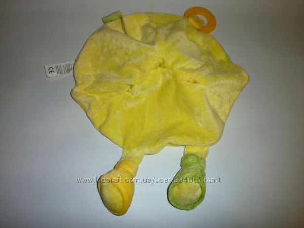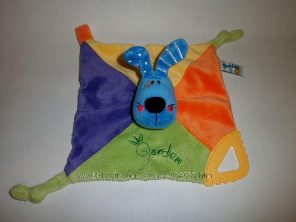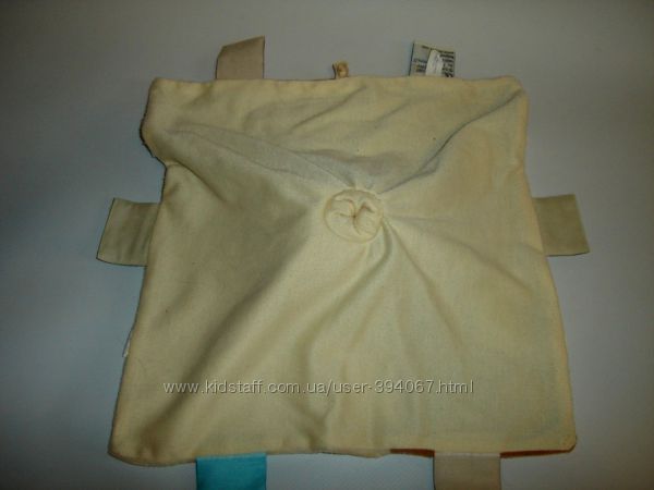 Также есть разнофактурный прорезыватель для зубов, с другой, стороны петелька , для подвешивания платочка, к кроватке, дугам игрового коврика или коляске.