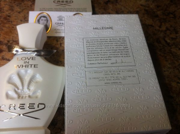 У любви в белом прекрасный аромат,тончайший....белые, нет, белоснежные цветы с горчинкой нарцисса. Т онкий аромат нарцисса приправленный нежнейшим мускусом. Впечатление - цветок в молоке. Очень нежно, утончено, бархатно. Бесподобный аромат, немного холодный, что нисколько ни умаляет его достоинств.