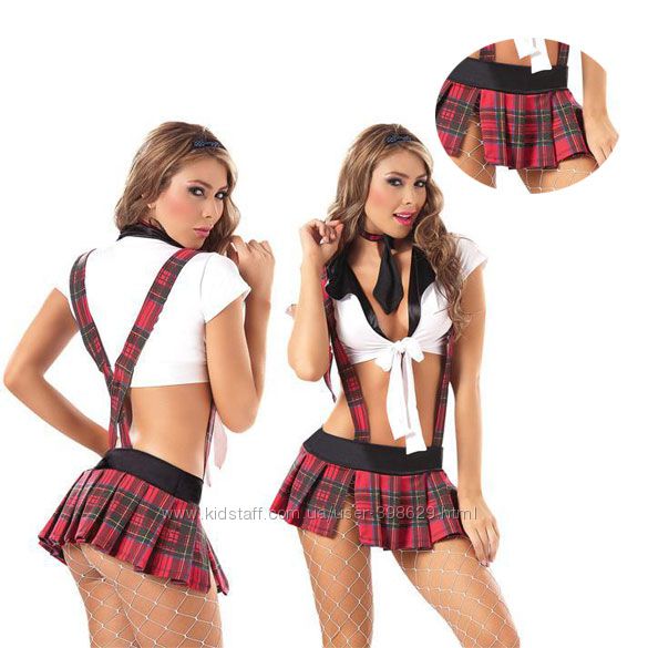 В комплект входит: Топ на завязках, галстук на липучке, юбка на подтяжках.