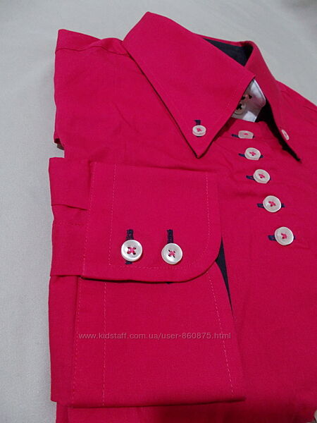 Рубашка новая в идеальном состоянии, но без бумажных бирок. Ткань тонкая (240 грамм), мягкая малинового цвета, отделка ворота и планки - белая и черно-синяя, манжетов - черно-синяя. Приталенный крой, на груди и спинке по две длинные вытачки, низ - полукругом, можно носить как заправленной, так и навыпуск, воротник и манжеты держат форму, оригинально расположенные пуговицы под перламутр в петлях с контрастной отделкой.На оф сайте подобные рубашки стоят 70€!