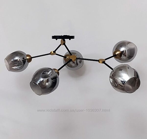 Люстра трансформер молекула в стиле лофт Материал корпуса - металл Цвет корпуса - черный+бронза Материал плафона - стекло Тип патрона - E27 Количество ламп - 5 Ориентировочные размеры - 90х70х30 -39 см (зависят от выбранной ориентации плафонов в пространстве) --- Отправка компаниями Новая почта, Укрпочта, Мист