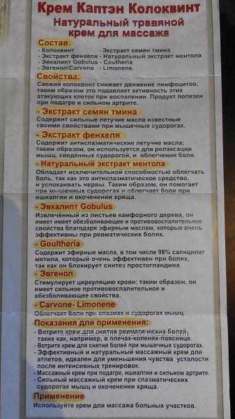 Повністю натуральний масажний бальзам Каптен Колоквінт, створений на основі чистих екстрактів лікарських трав колоквінту та чорного кмину, є ефективним засобом профілактики та лікування болю ревматичного походження, захворювань опорно-рухового апарату (артрит, артроз, спондилоартрит, остеохондроз, хвороба). п.), запалення сідничного нерва, спазмів м´язів, ідеомоторних (мимовільних) скорочення м´язів і болю сухожилля. Бальзам-крем Колоквінт має яскраво виражений розігріваючий, а також анестезуючий і заспокійливий ефект, при регулярному застосуванні істотно знижує прояв симптомів захворювань опорно-рухового апарату і повністю позбавляє неприємних відчуттів скутості м´язів.