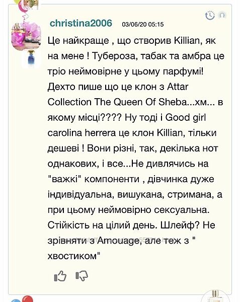 Стартові ноти ольфакторної піраміди відкриваються сяючими нотами апельсинового цвіту з Північної Африки та троянд, зібраних в Туреччині та Марокко. Наближаючись до серця, можна відчути метаморфози єгипетського жасмину Самбак, який відіграє фінальними водянистими акордами та хтивою туберозою. Відтепер, квіти Кіліану – ваш особистий сорт залежності.