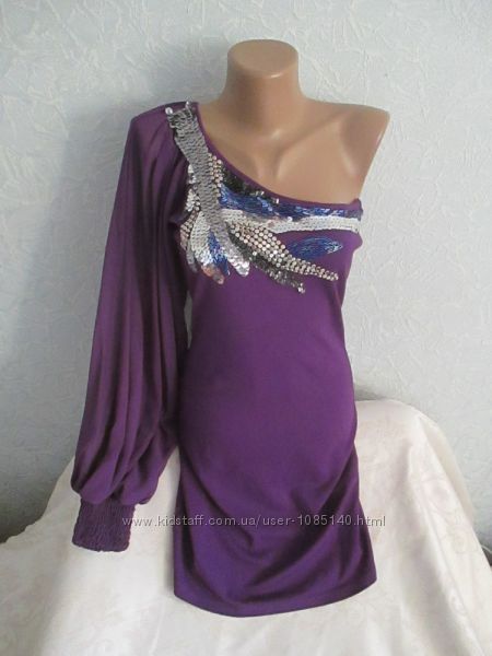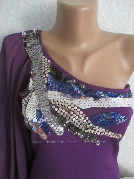 Девочки, платье обворожительное, эффектное, оригинальное, насыщенно-фиолетового цвета на одно плечо с широчезным шифоновым одним рукавчиком на манжете ( с резинок ), спереди вышитым ажурным украшением из паеток ( круглых и квадратных ), бисера и металлических заклёпок. Смотрится сказочно-красиво, эффектно и отличнейше подчёркивает фигурку!