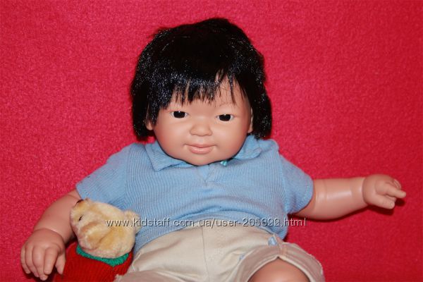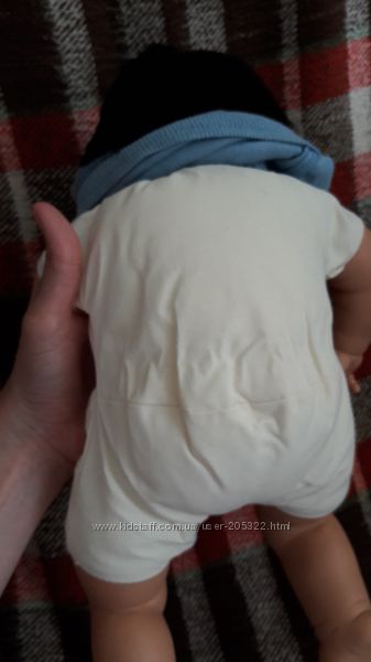 Пупс Miel de Abeja, зріст - 44 см. Волосся густе та прошите по всій голові. Вініловий, а тіло мʼяконабивне. На затилку є клеймо. Одягнутий в хлопкові штанці. Оригінал!100% передплата на картку Приват банка
