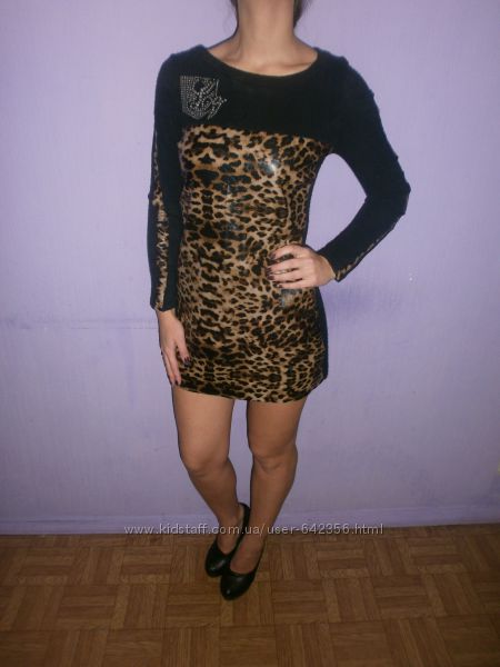 Шикарное платье с кожаными вставками Размер С,МЛеопард под кожу и на рукавах полоски леопарда под кожу