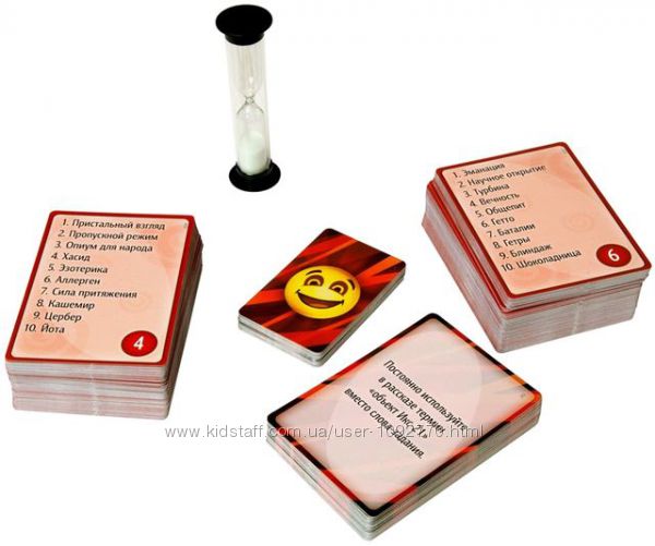 Состав игры: 196 двусторонних карт заданий, 27 карт действий, песочные часы, правила игры.