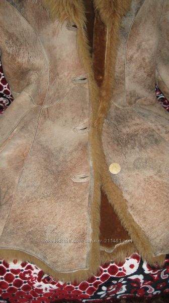 Тепла повністю натуральна дубльонка. Носилась активно, але в хорошому стані, ще послужить. Можна для дівчинки-підлітка, чи для тих жіночок, хто працює надворі. Має великий капюшон-"кобру", приталений силеут. Капюшон оздоблено хутром іншої текстури, по типу лами. Гудзики дерев´яні. Коли холодно, можна застібнути на потайний гудзик і повністю прикрити ділянку шиї. Рукав - реглан, довжина від шиї 76. Довжина по спинці 84. В грудях - 53 (я одягала в светрі на ОГ 108, то застібнулось, але туго). В талії 48. Вона як будь-яка натуральна дублянка трішки тягнеться. На питання відповім, розумний торг вітається.