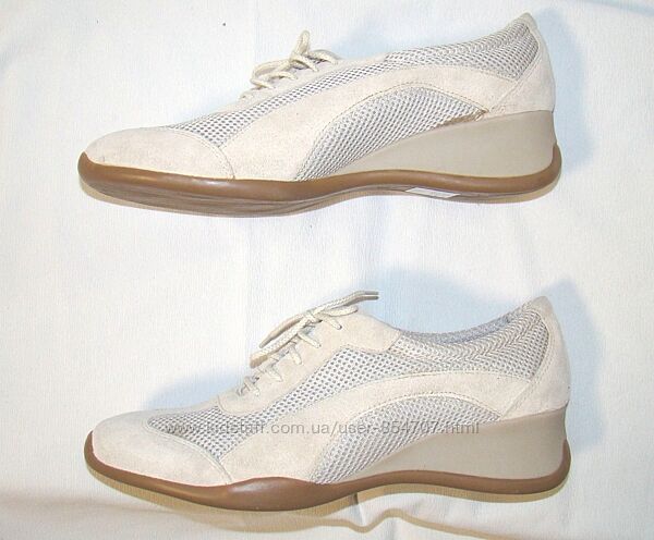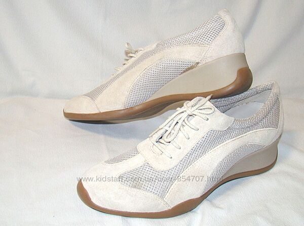 Кроссовки женские сникерсы замшевые Clarks (размер 41, UK7½D)Материал комбинированный, замша и текстиль. Цвет светло-бежевый. Внутри трикотаж. Стелька кожаная анатомическая. Есть нюанс - небольшая полоска клея возле подошвы изнутри правой полупары (на фото).