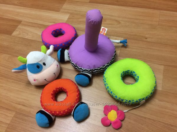 Мягкая пирамидка Коровка Smiki, Польша. Б/у в очень хорошем состоянии.Некоторые детали пирамидки имеют эффект погремушки, некоторые - шелестят при прикосновении. Ромашка к одному из колечек крепиться липучкой. Отличное качество материала. Яркие цвета :)