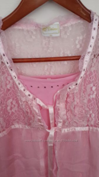 Крмплект. Шифоновая накидка с майкой. Накидка шифоновая с кружевом на груди и завязками спереди. Цвет розовый с еле заметными люрексовыми нитями . Рост 150см. Состояние очень хорошее. Одевалась один раз.Другие объявления продавца