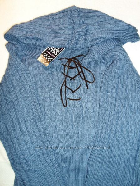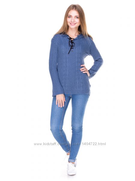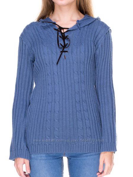 Описание лота: Пуловер синий с капюшономСтильный пуловер прямого силуэта, выполненный фигурной вязкой. Модель с длинным широким рукавом и капюшоном. V-образная горловина дополнена шнуровочкой.