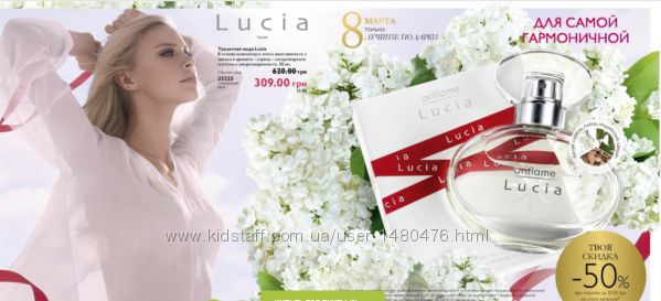 Туалетна вода Lucia Орифлейм 50млНаполненный светом и очарованием, этот аромат создает ауру гармонии и спокойствия. Основу композиции украшает белая сирень – олицетворение чистоты и умиротворенности.