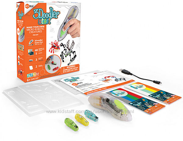 3D-ручка 3Doodler Start для детского творчества - РОБОТЕХНИКА - первая детская 3Д-ручка, которая создана специально для юных творцов. Набор - создан на пересечении технологий и искусства, позволяющий создавать роботизированные модели на свой вкус.При помощи 3Д-ручки, мотора на батарейках и специальных гайдов создавайте подвижных животных, шагающих роботов или динозавров любой сложности. Выбор ограничен только фантазией! Это отличная возможность расширить детский кругозор, воплощая любые фантазии в реальность. РОБОТЕХНИКА - расширенный набор, включающий дополнительный пластик и уникальные шаблоны, чтобы бесконечно творить в трехмерном формате.Ключевые особенности:Безопасная. Используется специально разработанный экопластик. Без вредных смоли клея. Сопло, через которое выходит пластик, прикрыто защитным колпачком - поэтому исключается возможность ожога при неаккуратном использовании. Легкая в использовании. Достаточно включить ручку, заправить в нее стержень и начать создавать 3D-модели. Удобно ложится в детскую руку. Беспроводная. Полного заряда ручки хватает на 45-60 минут беспроводного использования. Может работать и во время подзарядки. Обучает мышлению в 3Д. Помогает детям развивать навыки, необходимые для проектирования, планирования, строительства и понимания пространства! Развлечение без границ. Можно создавать всё, не ограничивая воображение ребенка. Дает жизнь старым игрушкам. Можно обновить и усовершенствовать старые игрушки. В комплекте:3D-ручка, 96 стержней, 2 шаблона, Кабель микроUSB, Мотор на батарейках (2 батарейки ААА не включены в комплект), 5 листов для рисования. Важно! Для нормальной работы ручки необходимо:Использовать только оригинальные стержни. Обязательно извлекать стержень из ручки после окончания работы (перед выключением). Для извлечения стержня достаточно дважды нажать на кнопку ручки (стержень выйдет в обратном направлении автоматически). Если остатка стержня недостаточно для полного его извлечения в обратном направлении из ручки, Вы не сможете удалить его автоматически. Вставьте в 3Д-ручку новый стержень и используйте его до тех пор, пока не будет полностью удален остаток предыдущего стержня. После извлечения стержня необходимо срезать его расплавившийся край. Рекомендовано для детей в возрасте старше 8 лет.