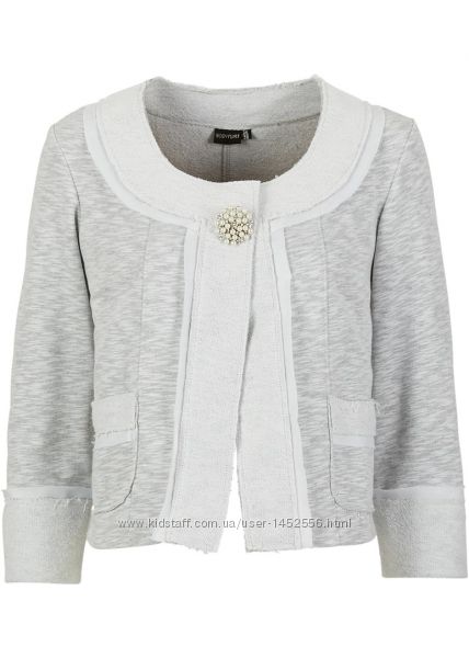 Комплект состоит из 2 изделий: кардиган и брошь. Трикотажная куртка-кардиган. Натуральный материал хлопок-трехнитка. Размер 32/34. Украинский 44/46 размер, международный XS, S, M.Оригинальная и единственная в своем роде модель. Очень нарядный за счет красивой брошки. Брошку можно носить и отдельно, прикрепив к платью или блузке.