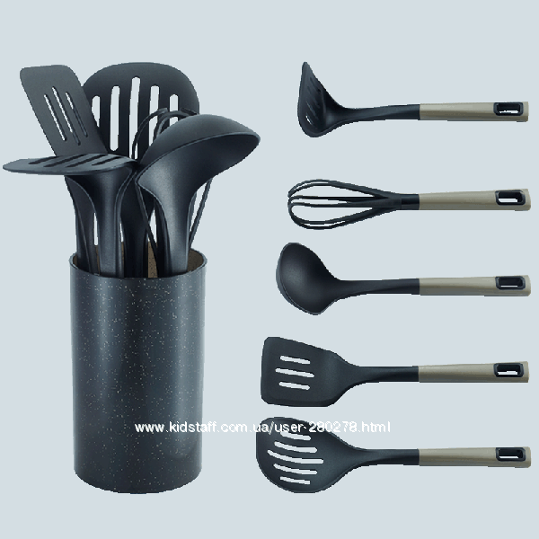 Кухонный набор изготовлен из жаропрочного пластика с нейлоновым покрытием. В набор входит: половник, картофеле-мялка, шумовка, ложка, ложка для спагетти, лопатка. Все предметы имеют в ручке отверстие для подвешивания. Современный дизайн набора удачно подчеркнет Ваш кухонный интерьер.