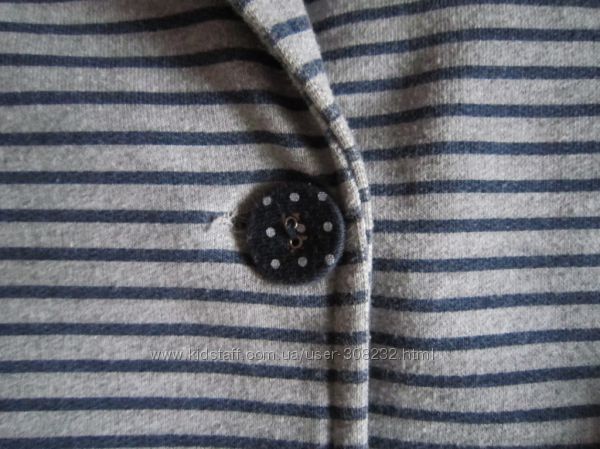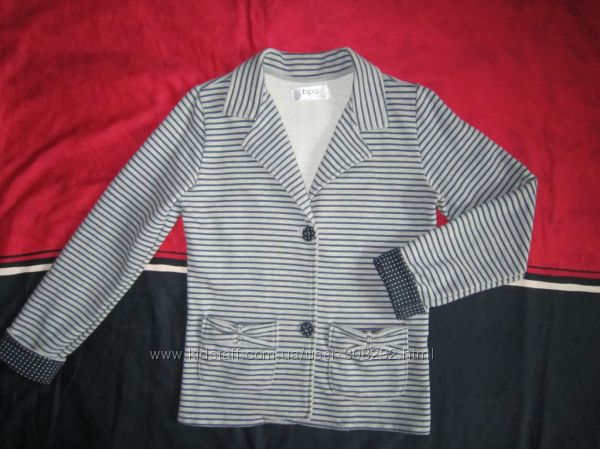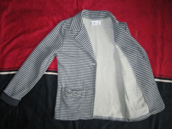 Стильный полосатый пиджак BonPrix на весну. Размер 140/146. Плотный 100% хлопок с начесом. Без подкладки. Интересные детали: карманы бантиком, пуговицы и отвороты рукавов в горошек. В очень хорошем состоянии, без дефектов.