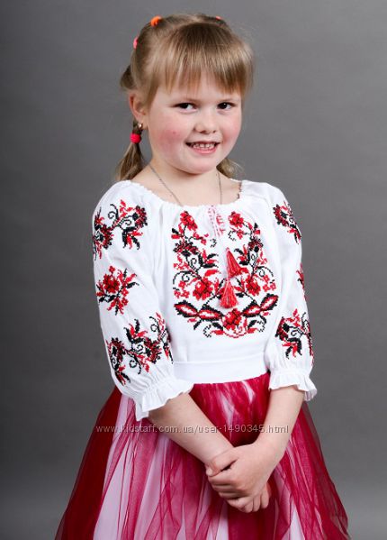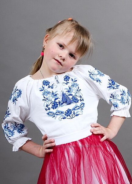 Дитяча українська вишиванка, 3.4 рукав, оздоблена червоним або синім орнаментом. Рукав-реглан має манжет на резинці, що забезпечує зручну посадку на руці. Виріз горловини регулюється китицями. Модель пошита з якісного матеріалу та відрізняється класичним вільним кроєм, тому носити її дуже зручно.Тканина: бязь(100% бавовна).