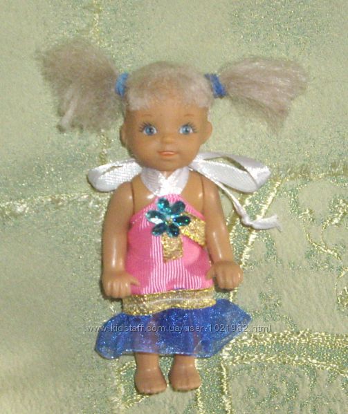 3). Симпатичные куколки Evi от Simba (Симба) и не только- высота-11 см. Куколка с короткими хвостиками( волосы нашиты по краю и посредине головы)- сгибаются ножки. У одной куколки в белом кружевном платье возле губ и глаза заметен розовый фломастер, у куколки в золотом с красным- пятнышко на лбу- смотрите фото.
