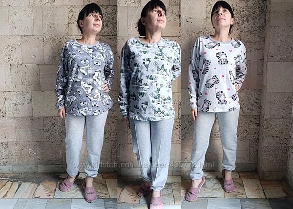 фото 3-10 Красива вільна та якісна жіноча утеплена піжама. Матеріал виробу бавовна 100%, тканина футер та ж сама байка з середини з не великою підпушкою. Модель повномірна. Штани на широкому стрейчевому манжеті, посадка висока, кофта вільного крою, рукав та горловина під кант - бейку.