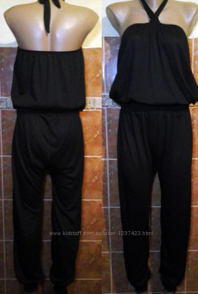 Черный трикотажный комбинезон.Плечи открыты,спереди завязка на шею.Над грудью,в талии и манжеты на резинках.Тонкое,мягкое полотно из полиестера.Верх объемный с напуском.Идеально на S. Длина от проймы по бок.шву 138 -------до талии 37 ПОГ 57 ПОТ 29 тянеся Штаны от талии бок.шов 96 внутр.шаговый 77 штанина в бедре ПО 30 посадка перед 26 зад 33 Указан наш 42рр.