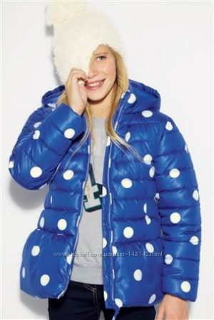 Подробное описание: Next Кобальтовая дутая куртка в горошек Некст с капюшоном на флисе 6-7Т.