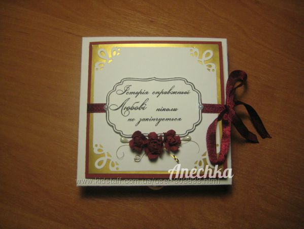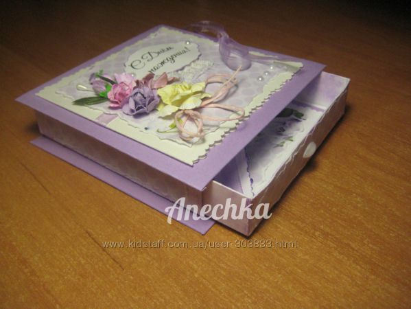 Оригинальной, красивой, а главное выполненной индивидуально под заказ коробочкой ручной работы для денежного подарка можно приятно удивить именинника или новобрачных. Размер коробочки 11х11х2,5см. Цена коробочки от 150 грн и выше.Больше моих работ вы можете увидеть [ссылка удалена]