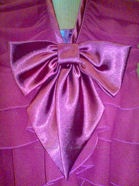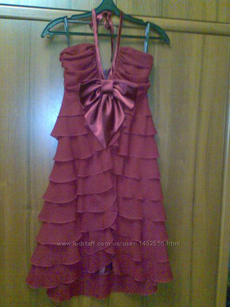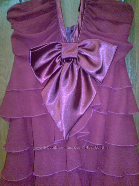 Коктейльное шифоновое платье бордового цвета бренда ALICE FASHION (без шлеек, завязывается на шее на атласную ленту). Платье украшает большой атласный бант на груди. Застегивается на молнию на спине, регулировать рост можно атласной завязкой на шее.Сзади открытая спина. Асимметричный крой: сзади немного длиннее, чем спереди.