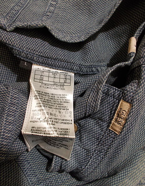 Рубашка новая в идеальном состоянии, но без бумажной бирки. Ткань тонкая, но тяжелая (380 грамм), эластичная, текстурная (типа чешуек), из нитей белого и помытого синего цвета с рыжеватым оттенком со светлыми пятнами. Приталенный фасон, застежка - кнопки, на вороте - металлическая пуговица, на груди карманы с клапанами, низ дугой, на кармане и на спине фирменные нашивки.На оф сайте подобные стоят 120€