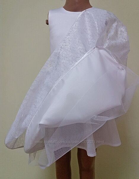 Святкова дитяча білосніжна сукня з бантом, модель № 60Опис: Верх сукні – атлас і підкладка з батисту. Ззаду потайна блискавка. Низ сукні складається з чотирьох шарів тканини: підкладка – батист, далі фатин (для пишності), далі – атлас, зверху – гіпюр. Сукня прикрашена атласним поясом з бантом.