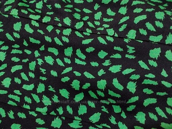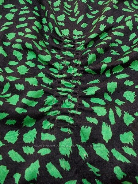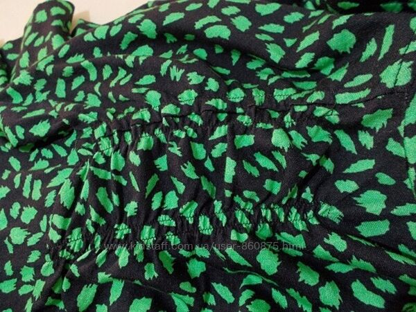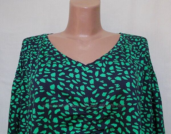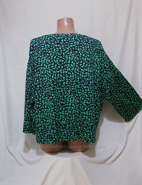 Блуза новая в идеальном состоянии, но без бирок. Трикотаж тонкий черного с синим оттенком цвета с мелким зеленым принтом (точнее цвет передан на детальных фото) мягкий, приятный к телу и эластичный. Фасон oversize, широкие рукава, V-образный вырез под ним присобранность от 4 строчек нитки резинки, такой же эффект на плечевых швах, по низу и на рукавах ровные манжеты шириной 9-10 см.На оф сайте подобные блузы стоят 80€