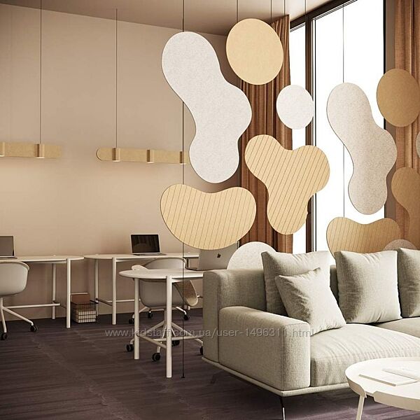 Акустичні світильники та системи (Україна), які повертають тишу.Елемент інтер’єру, який окрім основної функції дає локальний ефект поглинання шуму. Простіше кажучи, якщо ви з групою колег зібрались за столом, над яким розташований абажур з матеріалу з ефектом шумопоглинання, вашу розмову не буде чути в усіх куточках офісу. Значна частина звукових хвиль буде вловлюватися PET повстю.