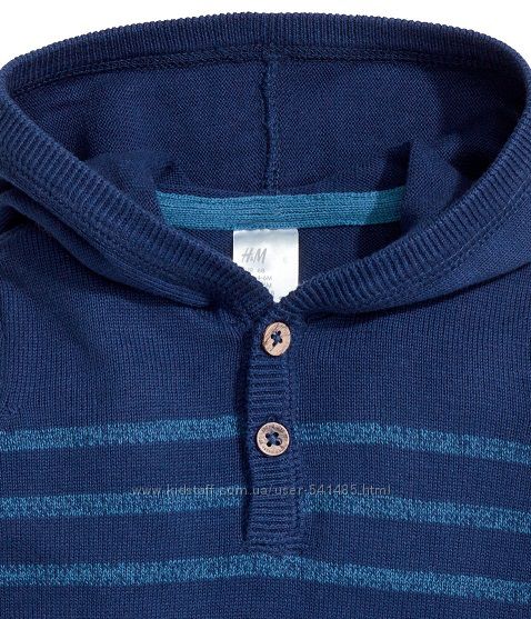 Светр з каптуром для хлопчика з м´якого бавовняного трикотажу. П опереду застібка на гудзики та кишеня кенгуру, з боків невеликі розрізи, спинка трохи довша за перед. З колекції дитячого одягу провідного світового бренду H&M.Розмір у наявності: 9-12 міс, зріст 80 см