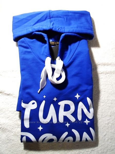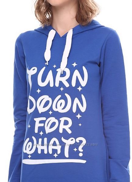 Синее платье с капюшономСтильное платье спортивного стиля, с капюшоном на широких шнурочках. Спереди - надпись, по бокам есть карманы. Спинка немного длиннее переда.