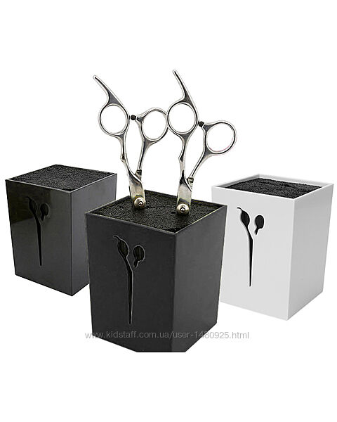 Подставка - держатель для парикмахерских ножниц.Подставка проста и удобна в использовании (вы просто ставите ножницы в любое место подставки). Нет необходимости упаковывать ножницы в чехол, аккуратно стараться положить их на стол на котором и так много инструмента и с которого они могут случайно упасть. Подставка поможет поддерживать в порядке ваше рабочее место и избавит от необходимости покупать новые ножницы взамен тех, которые упали и пришли в негодность. Подставка не скользит по поверхности; резиновые вставки снизу подставки надежно фиксируют ее на том месте куда вы ее поставите.