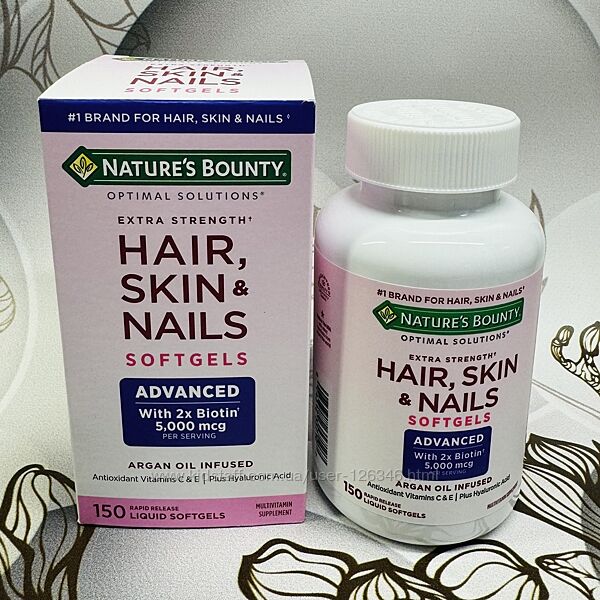 Нова формула Nature´s Bounty® з аргановим маслом, біотином, гіалуроновою кислотою та цинком зберігає здоров´я та красу вашого волосся, нігтів та шкіри, вітамін C бере участь в утворенні колагену, а вітамін E підтримує пружність шкіри.