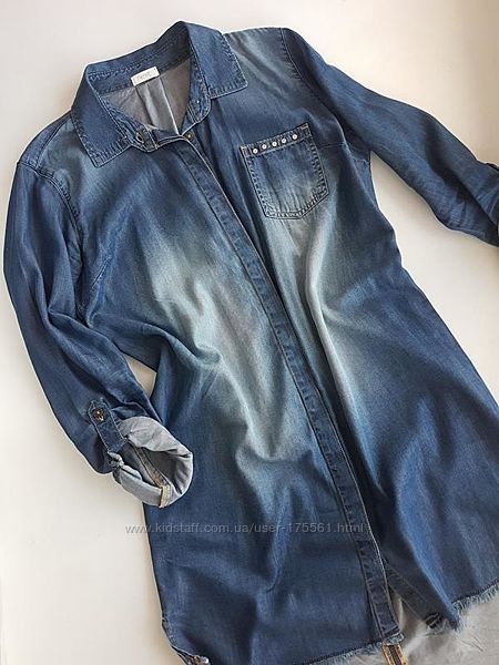Джинсовая рубашка платье Next Размер на S , на этикетке указан на 15 лет .Состояние- идеальное. Замеры: Дл-95(97 спинка), спереди 87 см ,пог-51 см, рукав-62 см, плечи-38 см Состав:66% коттон, 34% модал.