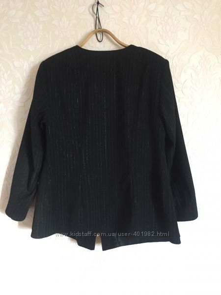 Красивый деловой пиджак на замке для полной женщины. Чёрный, в полоску, с люрексом. Фурнитура-серебристая. На карманах серебристые молнии. Подкладка гладкая.Пиджак слегка приталенный - делает фигуру визуально стройнее. Сшит на заказ-очень качественно. Отлично смотрится под брюки или юбку.