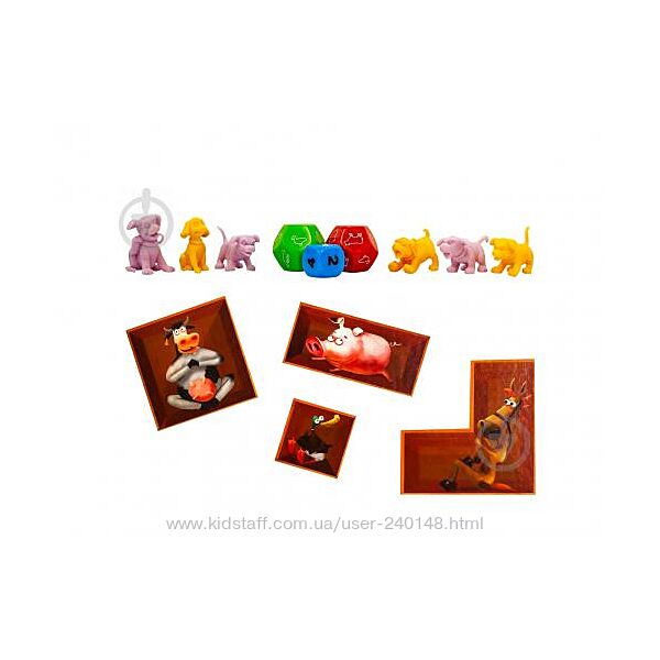 Комплектность: 4 игровых поля, 120 фишек животных, 2 многогранных зарика, 6 фишек собак, правила игры на украинском и русском.