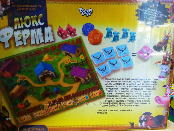 1) Ферма Люкс - украинский вариант игры Суперфермер .-300 грнФишки животных и 12-гранные игровые зарики - пластиковые. Поле и игровые тайлы из плотного картона. Хорошая полиграфия и приятные цвета. Правила игры на двух языках.