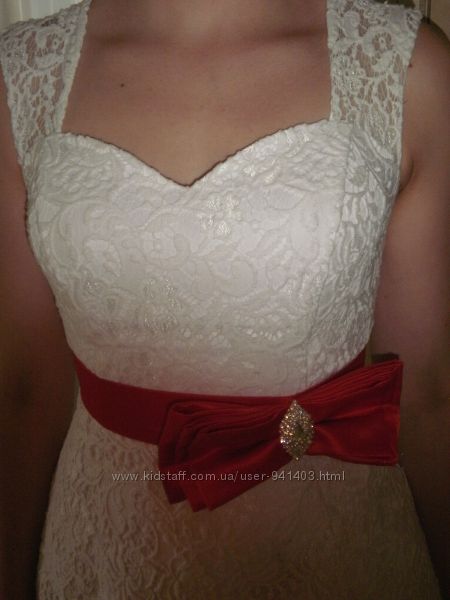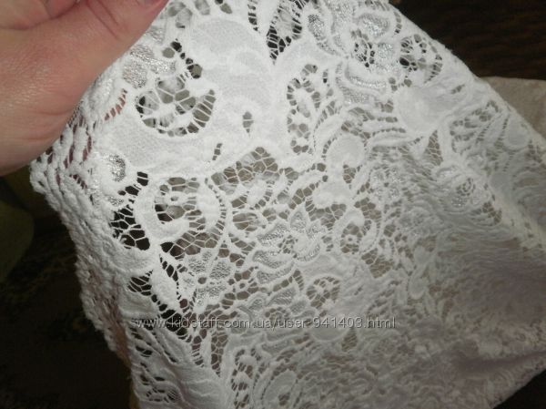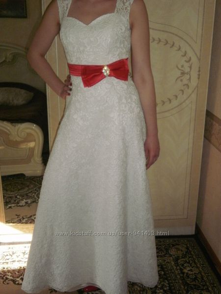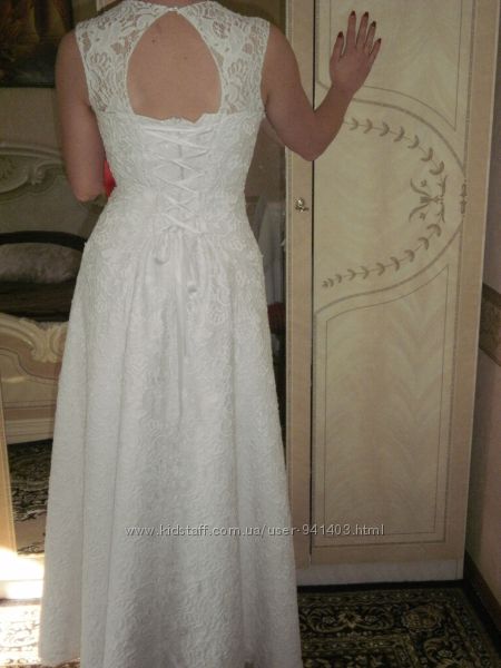 Сукня в ідеальному стані,одягнена на декілька годин .Може бути як на випускний вечір,так і весільний наряд.Верх повністю гіп´юровий,підкладка атласна.Ліф з чашечками.Взаді застібка замок+корсет.Пояс прикрашений атласною стрічкою і бантом,який оздоблений гарним переливчастим камінням .Також до сукні йде гіп´юрове болеро .Застібується на маленькі перламутрові гудзики.Рукав 3\4 -38 см,плечі 38 см,довжина 32 см,ПОГ 42 см.Болеро тягнеться.Заміри сукні : довжина повністю 140 смПОГ 44 см