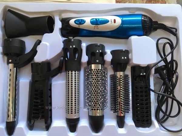 концентратор, щипцы для завивки, круглая щётка, насадка-расчёска, средняя щётка с убирающейся щетиной, большая щётка, двухсторонняя щётка